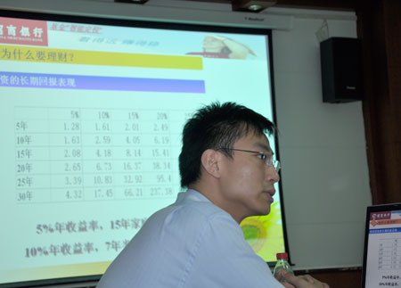 整個(gè)培訓(xùn)以探討交流的模式進(jìn)行,主講人從理財(cái)角度介紹證券的幾大分類以及投資方式,并結(jié)合自身,對(duì)特定的投資模式進(jìn)行了分析。接下來(lái)的環(huán)節(jié),主要采取提問(wèn)回答的方式,根據(jù)要求,主講人回顧了前幾年的金融形勢(shì),以前經(jīng)濟(jì)模式,簡(jiǎn)單展望了現(xiàn)在的經(jīng)濟(jì)發(fā)展。隨后從安全性、風(fēng)險(xiǎn)性等方面講解了基金、國(guó)債、分紅保險(xiǎn)、存款的不同特點(diǎn)。整個(gè)培訓(xùn)現(xiàn)場(chǎng)異常火爆,大家積極發(fā)言,主講人熱情解答,贏得陣陣掌聲。