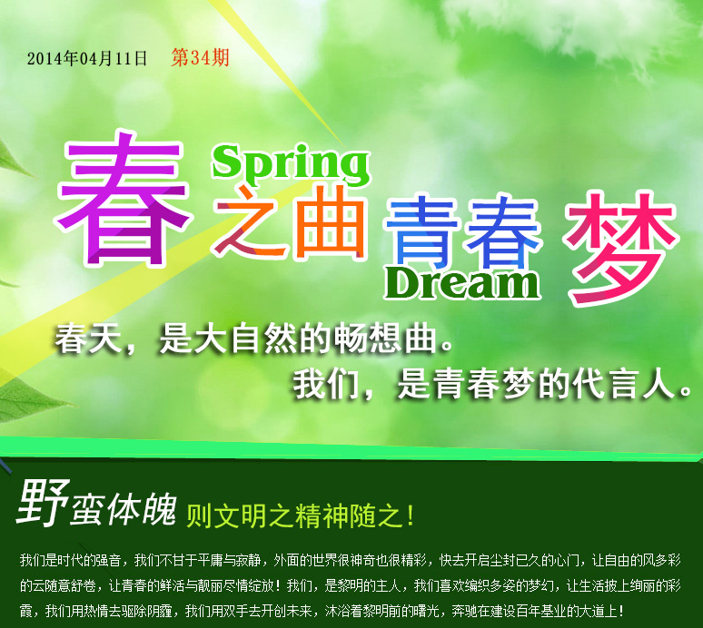 我們是時(shí)代的強(qiáng)音,我們不甘于平庸與寂靜,外面的世界很神奇也很精彩,快去開(kāi)啟塵封已久的心門(mén),讓自由的風(fēng)多彩的云隨意舒卷,讓青春的鮮活與靚麗盡情綻放!我們,是黎明的主人,我們喜歡編織多姿的夢(mèng)幻,讓生活披上絢麗的彩霞,我們用熱情去驅(qū)除陰霾,我們用雙手去開(kāi)創(chuàng)未來(lái),沐浴著黎明前的曙光,奔馳在建設(shè)百年基業(yè)的大道上!