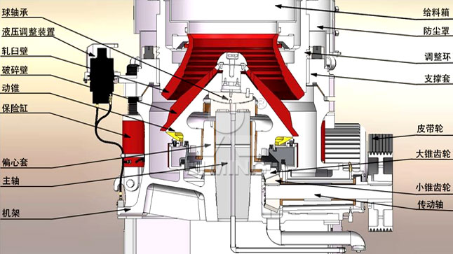 HPT液壓圓錐破碎機(jī)主要由機(jī)架部、支撐套部、調(diào)整環(huán)部、動錐部、偏心套部、傳動部和保險裝置部七大部件組成,主軸固定,電動機(jī)帶動傳動軸旋轉(zhuǎn),傳動軸通過齒輪帶動偏心套繞主軸旋轉(zhuǎn),再由偏心套帶動動錐部做偏心圓周擺動,從而實現(xiàn)連續(xù)的擠壓破碎石塊。