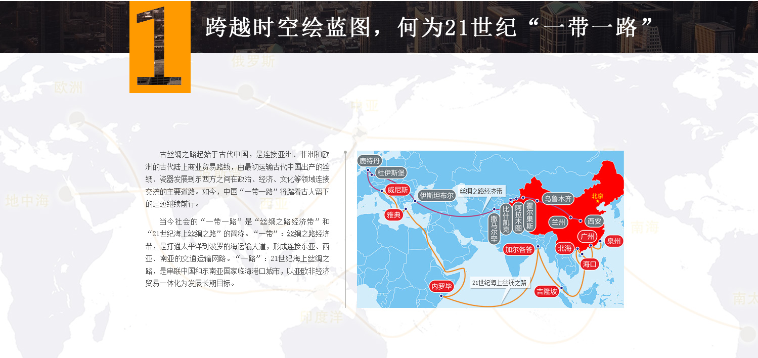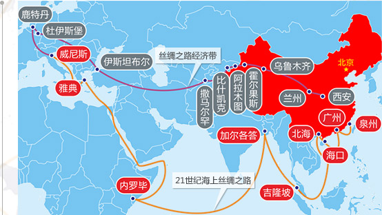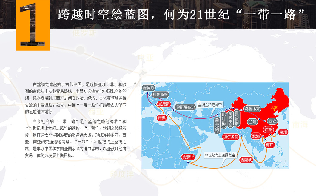 當(dāng)今社會的“一帶一路倡議”是“絲綢之路經(jīng)濟(jì)帶”和 “21世紀(jì)海上絲綢之路”的簡稱。“一帶”:絲綢之路經(jīng)濟(jì)帶,是打通太平洋到波羅的海運(yùn)輸大道,形成連接?xùn)|亞、 西亞、南亞的交通運(yùn)輸網(wǎng)路。“一路”:21世紀(jì)海上絲綢之路,是串聯(lián)中國和東南亞國家臨海港口城市,以亞歐非經(jīng) 濟(jì)貿(mào)易一體化為發(fā)展長期目標(biāo)。