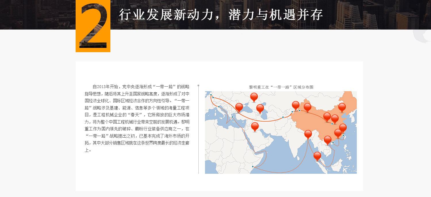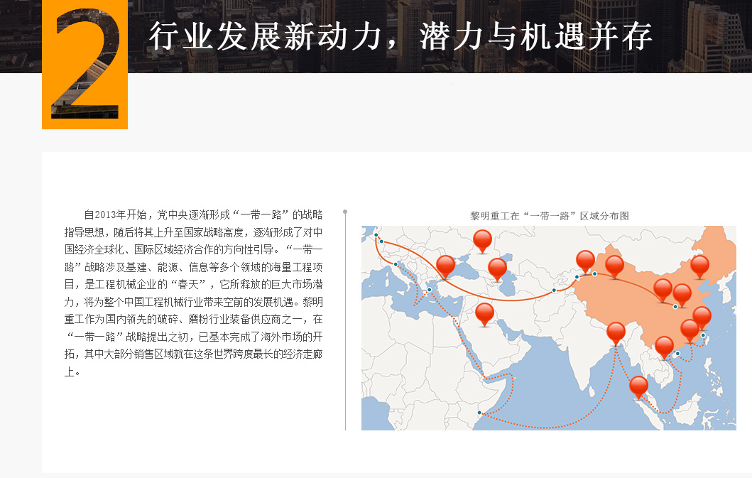 自2013年開始,黨中央逐漸形成“一帶一路倡議”的戰(zhàn)略指導(dǎo)思想,隨后將其上升至國家戰(zhàn)略高度,逐漸形成了對中國經(jīng)濟(jì)全球化、國際區(qū)域經(jīng)濟(jì)合作的方向性引導(dǎo)。“一帶一路倡議”戰(zhàn)略涉及基建、能源、信息等多個(gè)領(lǐng)域的海量工程項(xiàng)目,是工程機(jī)械企業(yè)的“春天”,它所釋放的巨大市場潛力,將為整個(gè)中國工程機(jī)械行業(yè)帶來發(fā)展機(jī)遇。黎明重工作為國內(nèi)知名的破碎、磨粉行業(yè)裝備供應(yīng)商之一,在“一帶一路倡議”戰(zhàn)略提出之初,已基本完成了海外市場的開拓,其中大部分銷售區(qū)域就在這條世界跨度最長的經(jīng)濟(jì)走廊上。